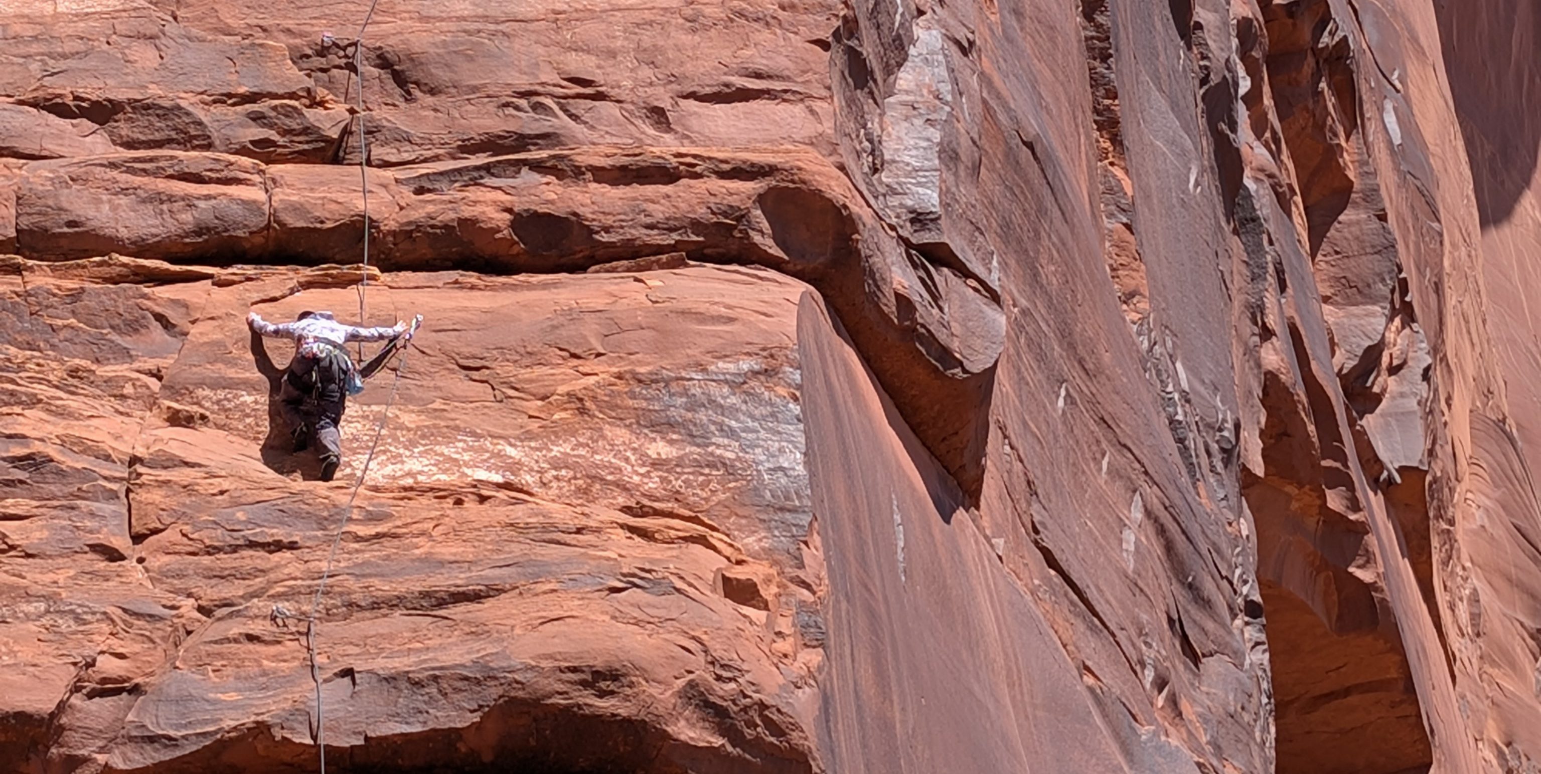 Terma is an excellent 3 pitch rock climb for those looking for something a bit more than a normal day at the crag. With the 3rd pitch being the hardest, with difficulty of 5.9, this is great for adventurous beginners or those looking to learn specific multi pitch skills. The route summits the mesa with fantastic views over Big Bend on the Colorado River and the La Sal Mountains. 3 rappels return you back to the base of the route.